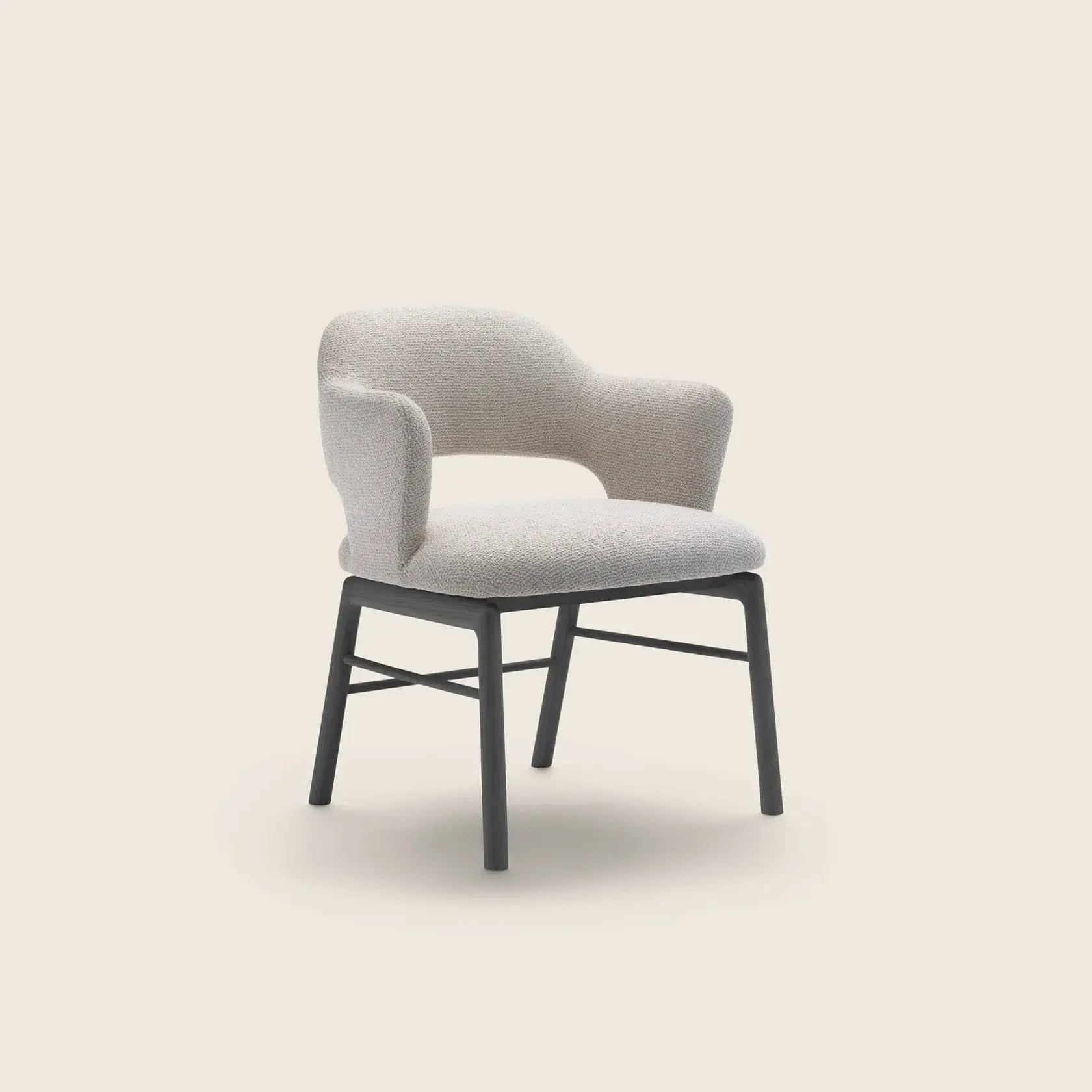 De stoel is verkrijgbaar in twee uitvoeringen – met of zonder armleuningen – en rust op een houten onderstel in verschillende verfijnde afwerkingen. De onafneembare bekleding, leverbaar in stof of leder, benadrukt de aandacht voor detail en het vakmanschap dat kenmerkend is voor Flexform.