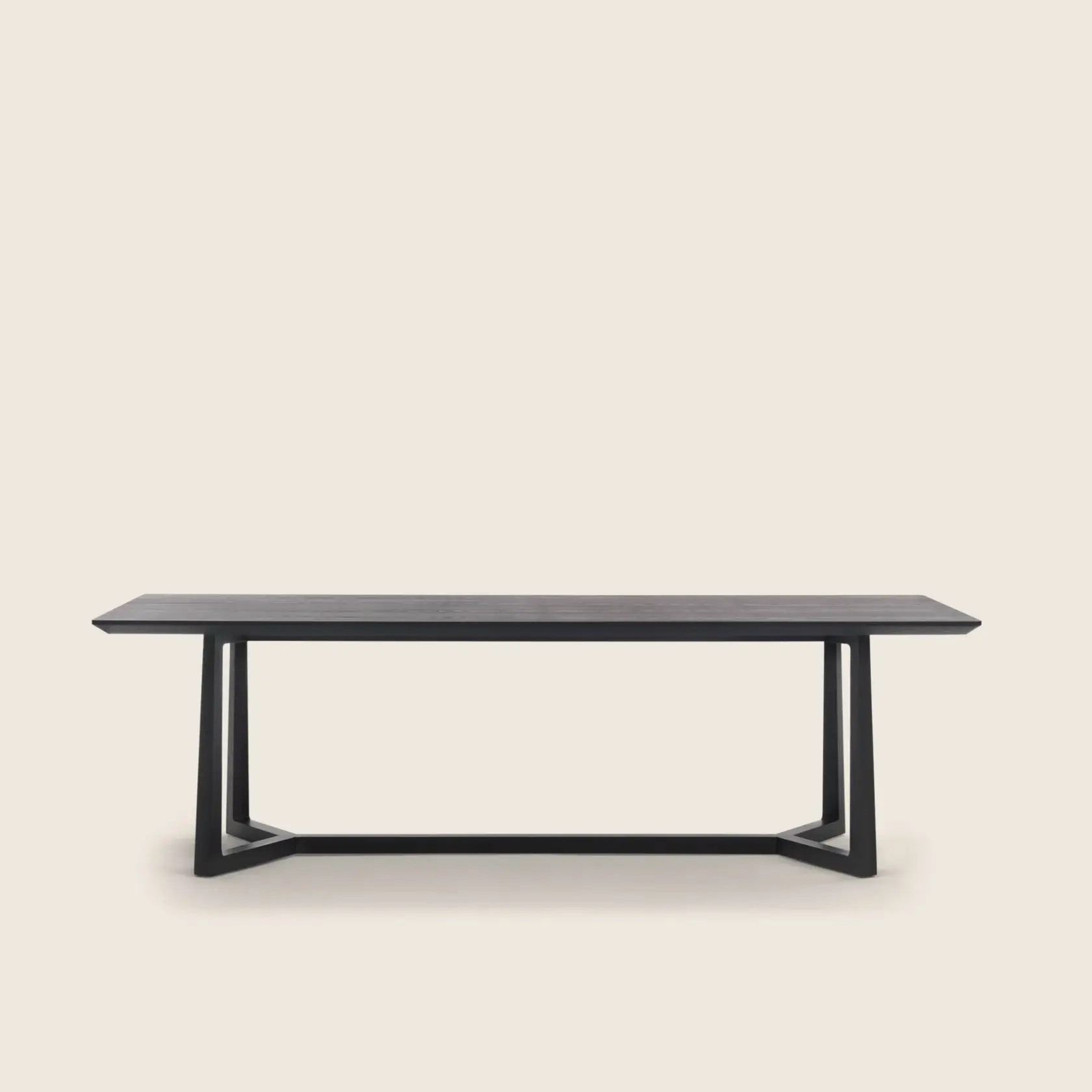 Het meest opvallende element is de sculpturale potenconstructie: vier elegante poten vloeien samen tot één langgerekte, horizontale drager die parallel onder het tafelblad loopt. Dit detail geeft de tafel niet alleen visuele lichtheid, maar benadrukt ook het ambacht en de verfijnde technische uitvoering die typisch zijn voor Flexform.
