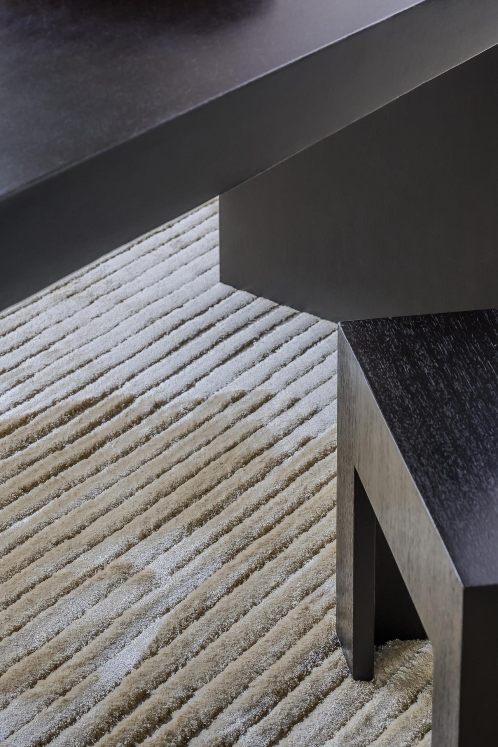 Het tapijt wordt uitgevoerd in de luxueuze SOFT-kwaliteit met een basis in dikke Nieuw-Zeelandse wol. De lijnen variëren subtiel in dikte, wat zorgt voor een speels en dynamisch effect zonder de rust van het ontwerp te doorbreken. Dankzij de hoogwaardige mix van materialen krijgt Glimmer een zachte touch, warme feel en een verfijnde glans.